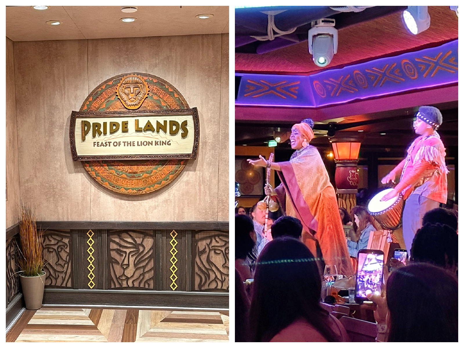 - The entertainment was perhaps the most dissapointing. After having seen all the Disney dining shows we expected amazing, but this was just mediocre at best. Maybe better than no show at all. The entertainers were dressed very simply, looked more like the wait staff from Tusker House – there are no headresses or vibrant costumes. The show consists of the retelling of the Lion King story through songs and dance with the help of a drum. There is a female vocal that does a good job, a male that was okay, a drummer that was okay, and a girl in a leotard that performed some mondane dance moves. If you looked around the restaurant no one watched the dancer. There were no characters, which was expected based, but the lack of vibrant costumes or wow element was super dissapointing.